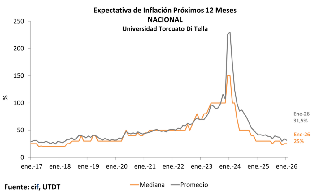El Centro de Investigación en Finanzas de la Universidad Torcuato Di Tella publicó el reporte mensual de expectativas de inflación de enero cuyos datos más relevantes resumimos a continuación: